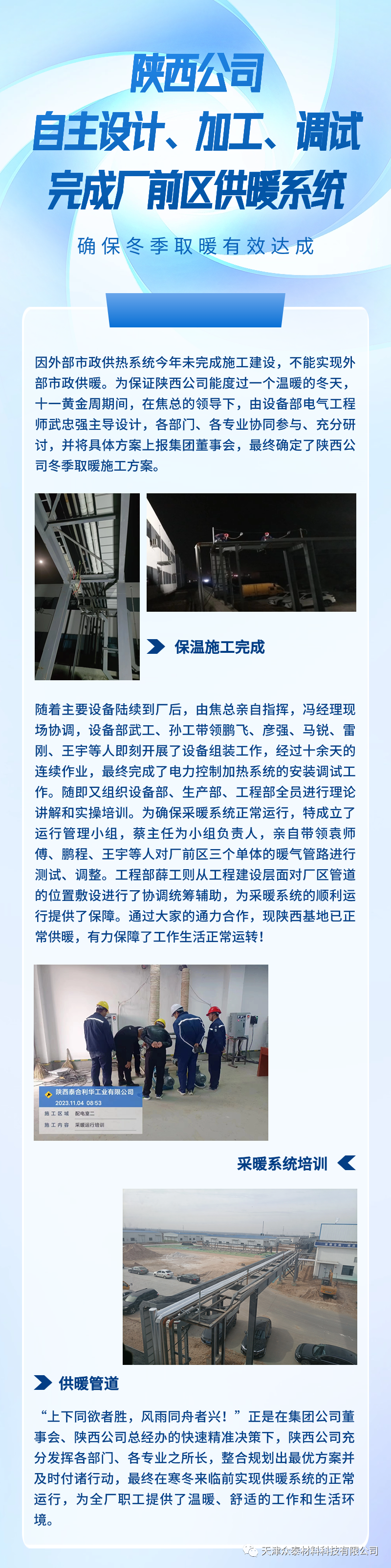 陜西分公司自主設(shè)計、加工、調(diào)試完成廠前區(qū)供暖系統(tǒng),確保冬季取暖有效達(dá)成